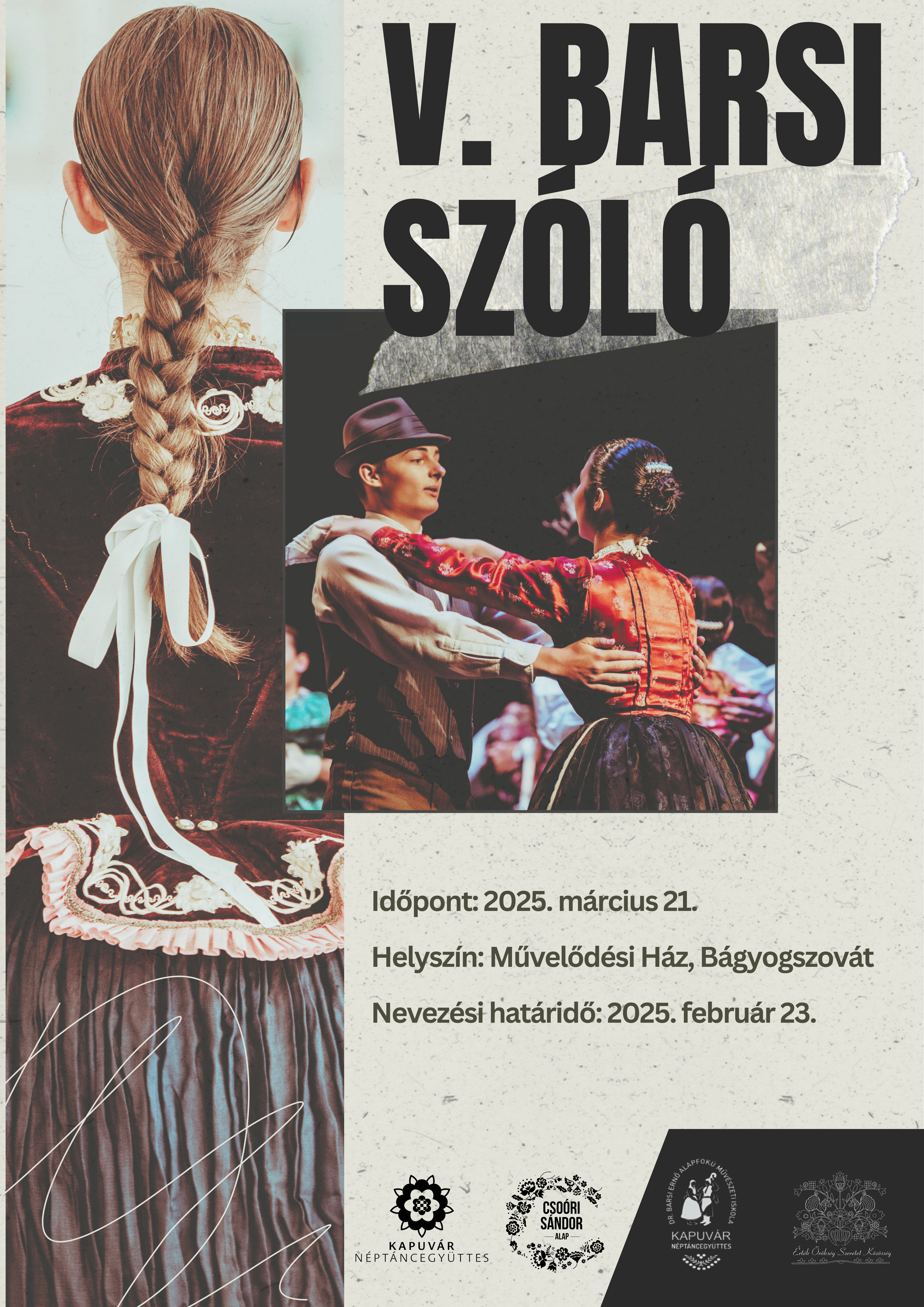 Örömmel értesítjük a néptáncos közösségeket, hogy a Dr. Barsi Ernő Alapfokú Művészeti Iskola 2025-ben megrendezi az V. Barsi Szólótánc Versenyt. Célunk, hogy a gyermek és ifjúsági korosztály kapjon önálló bemutatkozási, találkozási és megmérettetési lehetőséget egy baráti találkozó formájában.
